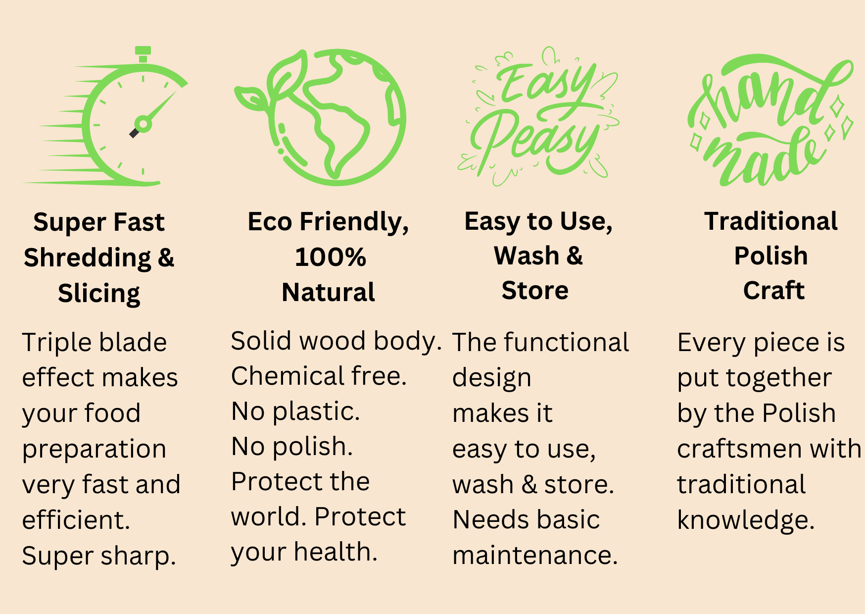 Our products are made of beech wood, which is traditionally used for its tremendous durability. You don’t have to worry about water damaging or staining your shredder. Beech wood is famously resistant to prolonged exposure to water. The wood is not treated with paint, stain, polish or any other chemical substance. The natural look of the beech wood will add that wonderful vintage touch to your kitchen.