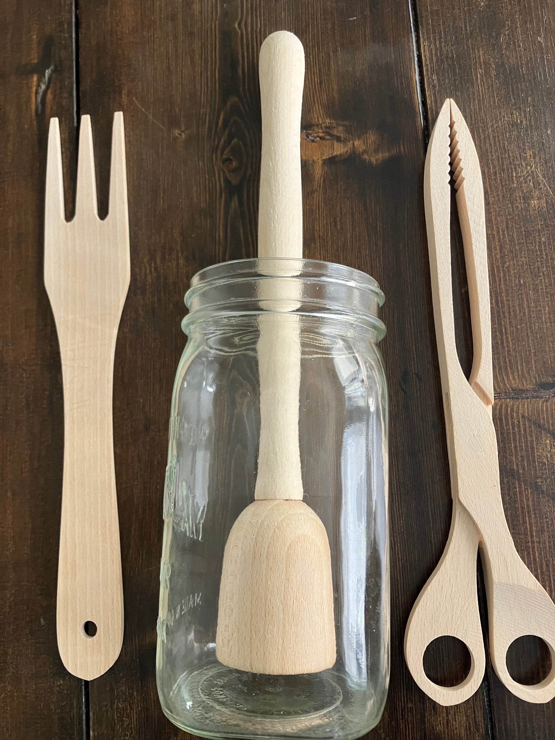 Sauekraut Pounder for Mason Jars, Pickled Vegetables Tongs, a Sauerkraut Fork. Solid wood.